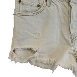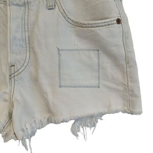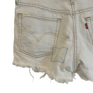 In excellent condition. Levis 501 white bleached jean shorts. These cut offs are unique with distressing and with patched details. Classic 501's with a button fly and a high rise fit. 100% cotton. Flat lay measurements: 15" waist, 10" rise, 2.5" inseam.