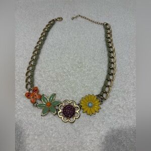 Brighten up any outfit with this whimsical Lia Sophia statement necklace! Featuring a cheerful mix of enamel flowers in mint, yellow, and purple tones alongside an orange butterfly, this piece is full of charm and personality. The gold-tone chain is interwoven with khaki green cord for an earthy yet playful finish. Perfect for spring and summer looks, or anytime you want to add a pop of color.