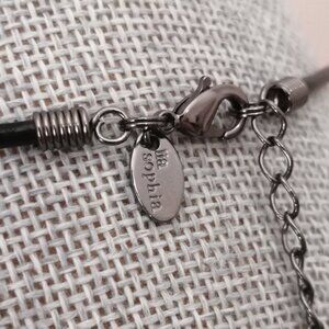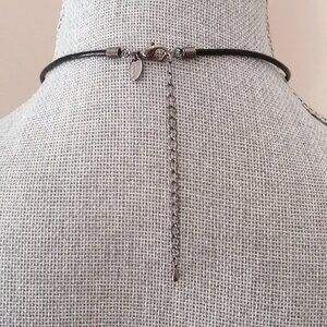 This necklace features a fairly large statement pendant, hung on a black leather (?) cord. It closes with a lobster clasp and has an attached extender chain, as well as a brand hangtag, in a gunmetal finish.