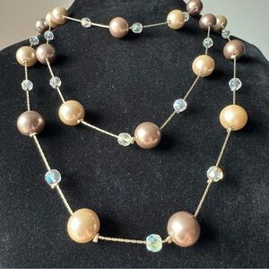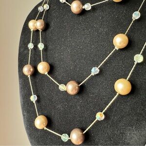This exquisite Lia Sophia necklace showcases a sophisticated blend of gold, beige and brown hues. Long station necklace with clasp that can be worn long or doubled or tripled around the neck. Looks beautiful when worn layered. Lovely neutral tones that will elevate any outfit without overwhelming your ensemble—simple yet classy! The necklace is adorned with spherical glass pearls and contrasting smaller faceted iridescent spacer beads, creating a harmonious and elegant design.