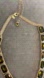 Detailed necklace in matte gold with olive crystals. It is 18-23 inches long.
