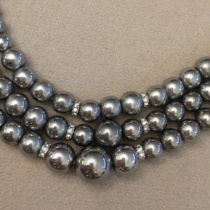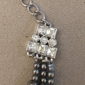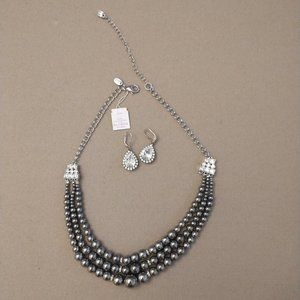 Lia Sophia blingy necklace (NWT, never worn) and blingy earrings to complete the set - also Lia Sophia, purchased at same time and only worn once. Necklace design highlights: gun metal beads and blingy rhinestones, with clasp hook closure. See last 3 pics for measurements. Lia Sophia tag was never removed as shown in pics. Blingy earrings with rhinestones were only worn once and there was no tag attachment on these - no missing rhinestones, excellent condition.