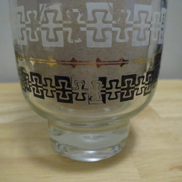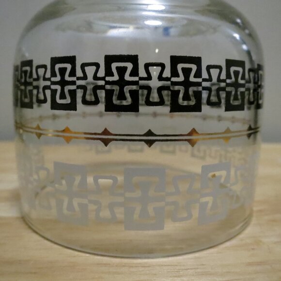 Add a vintage touch to your dining table with the Libbey Glass Condiment Jar Trio. These jars have black, white, and gold geometric bands that give them a stylish look that will complement any table setting. The jars come with metal lids and a metal stand, making them easy to display and keep your condiments fresh. The jars are 3 1/2" H x 3" diameter. The metal lids have hammered pine cone decor. Made in the United States, these jars feature the iconic Libbey brand. Perfect for any MCM-themed home, these condiment jars are a great addition to your dinnerware collection. Get your hands on this unique set today!