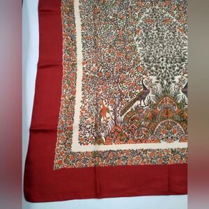 Fabulous! Liberty of London England silk scarf,burnt orange- red border,with Peacocks in a tree,orange floral pattern thru out the scarf.