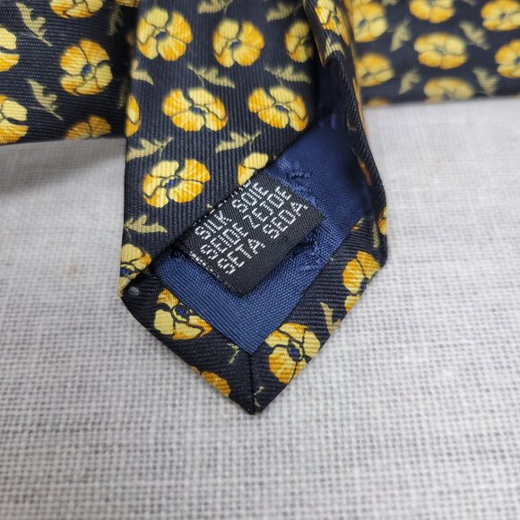 This lovely silk neck tie has a black background with a light orange poppy motif. It measures 58 inches long and 3 1/2 inches wide. It is in excellent condition, suitable for gifting.