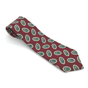 Maroon background neck tie with cream, teal and yellow-gold paisley-like pattern.