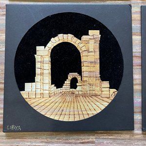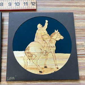 Set of 4 hand crafted straw husk art pieces, made in Libya using an etching/burning technique. Each piece has a fold-out cardstock stand for desktop display; one has a hole punched through the top for hanging. 8" square. Pre-owned condition: some denting to corner edges, surface wear from display/storage. See photos.