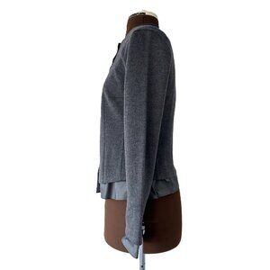Elegant grey wool cardigan with built in polyester vest extends beyond the cardigan to provide visual interest along the collar, front and hem. The same material is attached to the sleeves to mimic the same aesthetics. Jacket has button front closure and long sleeves. A great replacement for a blazer.