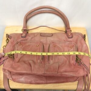 Absolutely stunning and supple leather purse! Shows signs of wear on the outside but the whole purse is a distressed look. Removable strap is adjustable up to 46”. Pinky/coral in colour.