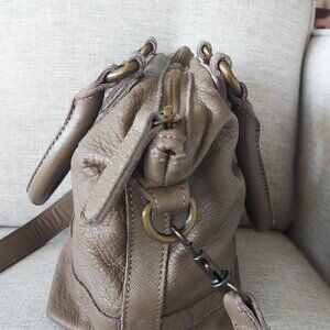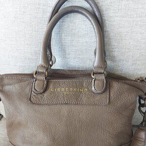 Gorgeous handbag by Liebeskind is made of the butter soft taupe/grey pebbled leather. It has a detachable, adjustable crossbody strap and two handles if you prefer to carry it on your arm. Inside it is lined in sturdy fabric, has two small side pocket, a large open pocket and a zip pocket which are reinforced with leather at the edges and there is a generous open pocket in the centre. It is fantastic for visibility with the light coloured lining and the wide opening at the top. It measures 8 inches (20.32 cm) by 12 inches (30.48 cm) in the body and 5.5 inches (13.97 cm) deep. A bag that takes you everywhere, everyday.