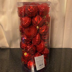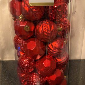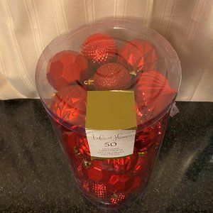Brand new never opened Life At Home 50 holiday ornaments. Beautiful combination of sparkly, shiny and matte red bulbs. The container measures 14.5" inches tall and the bulbs measures roughly 2" - 2.5" inches wide (measured through the plastic)