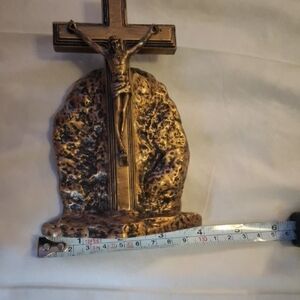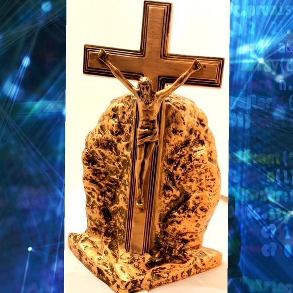 For sale is a vintage Life Symbols "Crucifix" sculpture by Batesville Casket Co., Inc., dated 1999. This hand-painted piece features a detailed figure on a cross with a textured rocky base, finished in a bronze-like tone. Perfect for religious decor, collectors, or as a meaningful gift. In excellent condition with no chips, cracks, or fading—light wear from age.