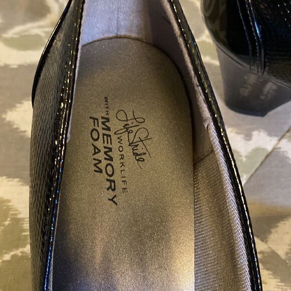 Life stride work life with memory foam US 8.5 in new condition. Full disclosure the size says 9.5 but they are definitely smaller than that. I’m a 9 and they are tight on me. I’m guessing they will fit an 8.5 perfectly. I’ll include measurements in photos. These shoes are super comfy!