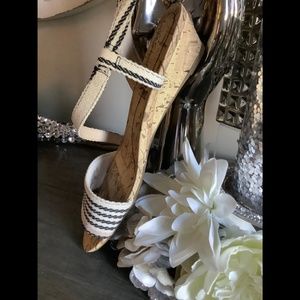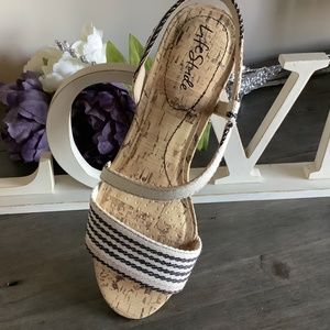 Versatile wedge sandals that boast arch support, a cushioned foot bed, and a cork-wrapped heel.