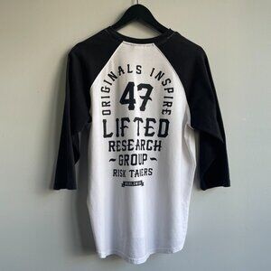 Lifted Research Group Womans B&W Baseball T-Shirt, size LRG. 3/4 sleeve. Graphic logo on front and back. Gently used.
