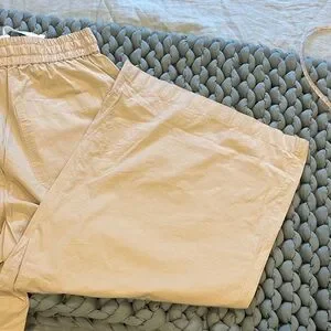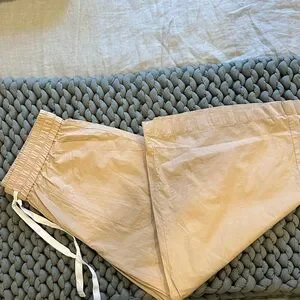 Casual lightweight drawstring pants in a soft beige tone. Elastic waist with white drawstrings. Clean, simple silhouette. Versatile everyday style. NWOT wide leg capri style