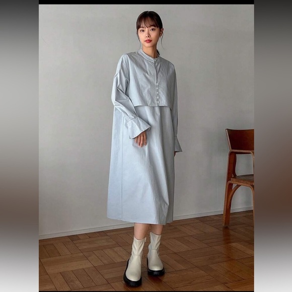 Elegant light blue dress with button-up front. Long sleeves add a classic touch.
