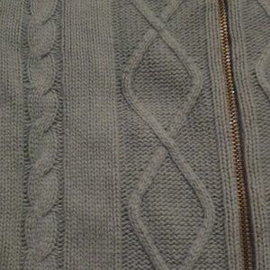 A pale blue cabel knit sweater. Not heavy but not light either and perfect for the fall weather or a nice time at a bonfire.