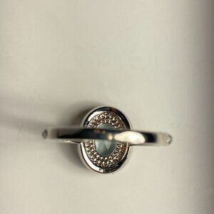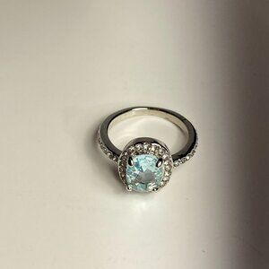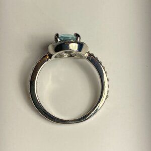 Light blue costume jewelry ring with large centre light blue stone and small stones around it, and along the band.