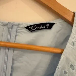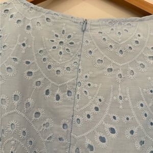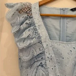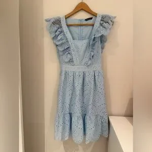 Charming light blue dress with eyelet details and ruffle sleeves. Perfect for a summer day or vacation