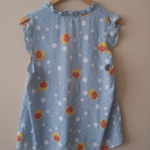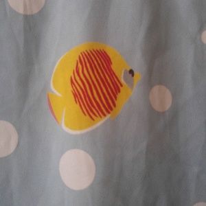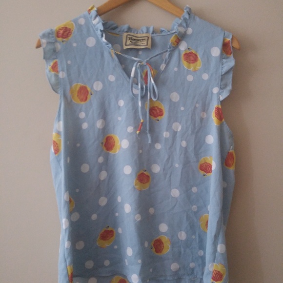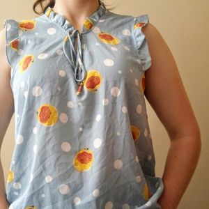 Light blue blouse with yellow and orange fish on it, and lighter coloured bubbles. Has ruffled, short sleeves, and a ruffled collar. There is a little opening on the front, with a tie to close it. Material is a little sheer. Bought it at a local store with no designer tags on it (only the tag from the store).