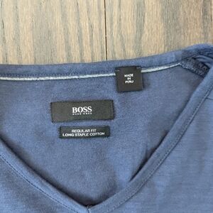 Really nice light blue men's vneck T-shirt from Hugo Boss. It is in like new condition, only lightly worn a few times. The fabric is lightweight and great for the spring and summer or for layering in cooler weather.