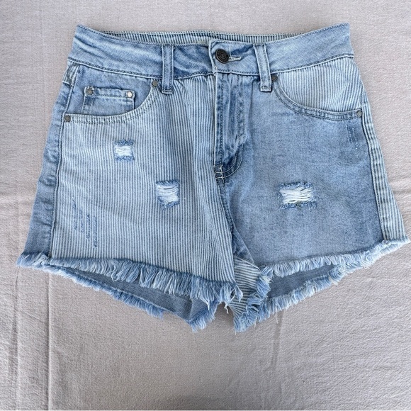 Trendy jean shorts with frayed hem. Features a stylish light blue wash. Ideal for casual wear.