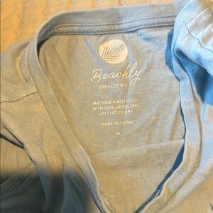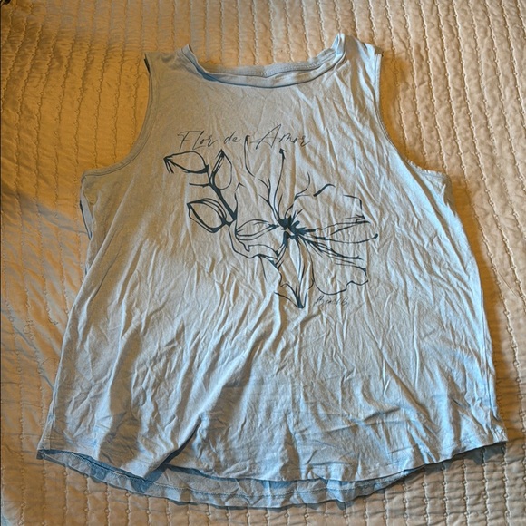 Light blue muscle tee with floral design. Sleeveless and comfortable.