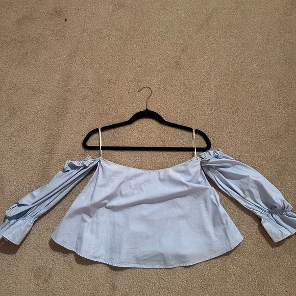 Chic and stylish light blue off-shoulder top perfect for any occasion. Enjoy the comfort and elegance of this must-have piece in your wardrobe.
