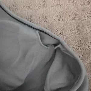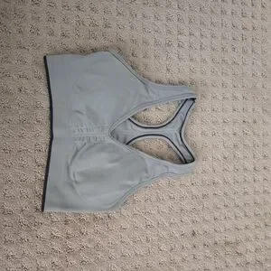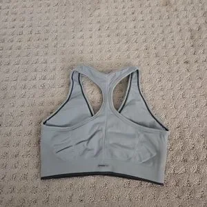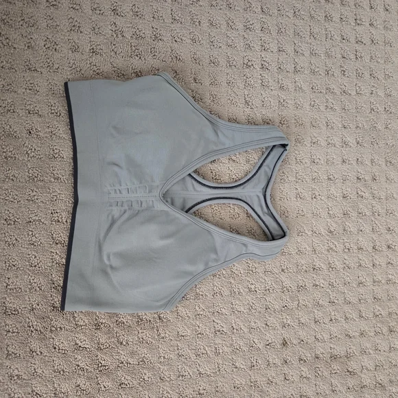 Racerback sports bra with removable padding. Smooth fabric and wide underband for stability. Simple, minimalist design. Great for workouts or everyday wear.