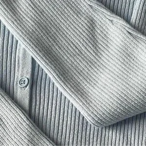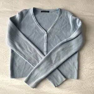 Stylish light blue ribbed cardigan. Perfect for layering. Almost perfect condition except for a tiny stain on the back of a sleeve