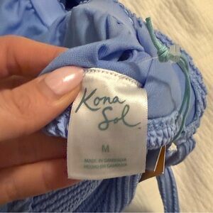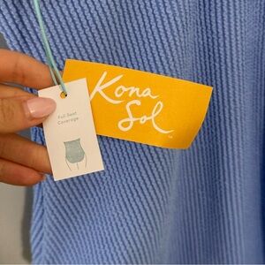 Stylish light blue ribbed swimsuit. Perfect for beach days.