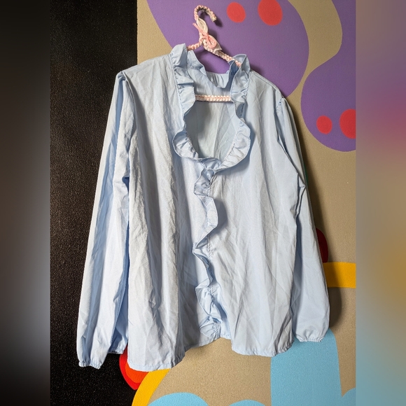 Elegant light blue blouse with ruffle details. Perfect for any occasion.