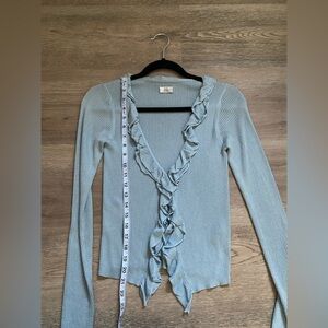 Chic light blue cardigan with ruffled edges. Purchased from Aritzia. Size medium. Stretchy material. Approximate measurements in photos.