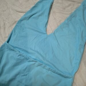 Flattering and chic one-piece swimsuit in a soft light blue shade. Features a deep V neckline, adjustable wrap tie at the waist, and high-cut leg for a confidence-boosting fit. Smooth, stretchy fabric offers great support and comfort — perfect for beach days or poolside lounging.