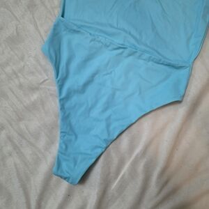 Keywords: one piece swimsuit, wrap swimsuit, blue swimwear, flattering fit, beachwear, summer outfit, vacation look