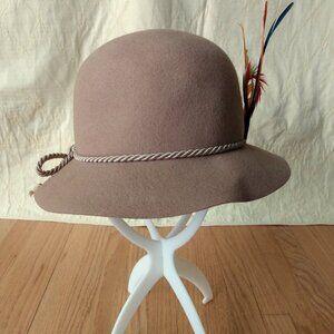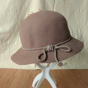 Light Brown Felt Hat with Feather Brooch Pin and Silky Cable Rope Bow