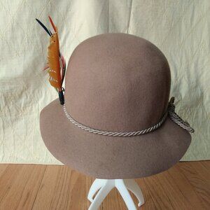 Light Brown Felt Ladies Hat with Feather Brooch Pin and Silky Cable Rope Bow