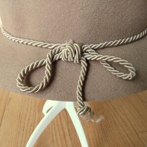 Light Brown Felt Hat with Feather Brooch Pin and Silky Cable Rope Bow
