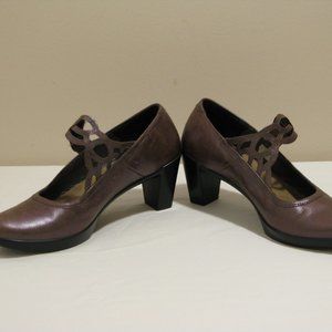 This Naot shoe is a feminine maryjane shoe with a delicate cutout velcro strap at the instep. Naot's anatomic cork & memory foam footbed is wrapped in leather & microfiber and molds to the shape of the foot with wear. This collection uses a hand-sewn stroble construction making it strong and extremely flexible. This shoe features a 2 1/2" heel.