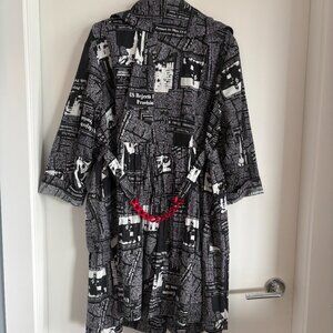Very light cotton shacket in a newspaper print with red buttons and plastic chain details. Great as a layering piece with a fun style.