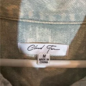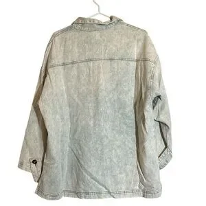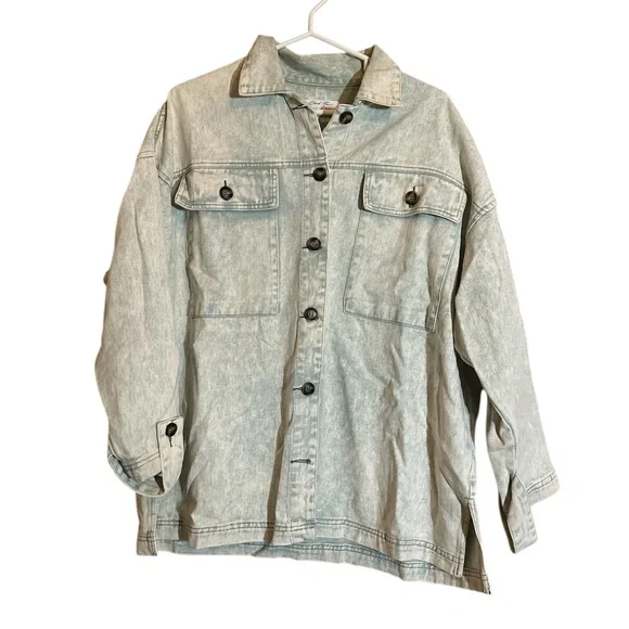 Stylish light denim jacket with button-up front. Features two chest pockets and buttoned cuffs.