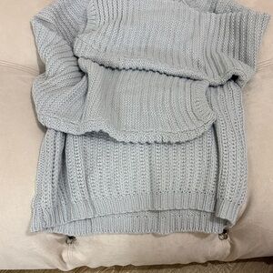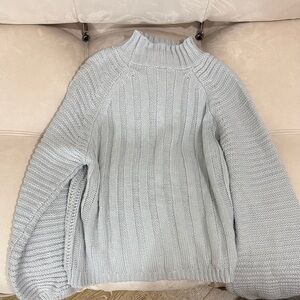 Soft light gray ribbed knit sweater with a mock neck. Balloon sleeves add a modern, relaxed silhouette. Comfortable and versatile for everyday wear. Easy to style with jeans or skirts. Light gray color delivers a neutral, polished look.