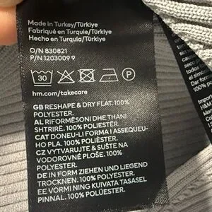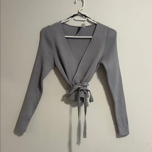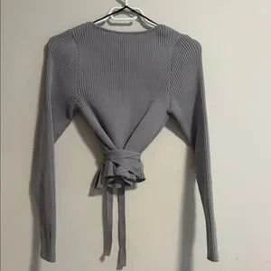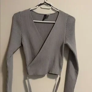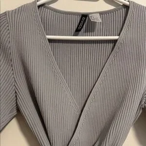 Light gray cropped rib knit top from H&M Divided. Has faux wrap waist and V-neck design. Stretchy fabric.