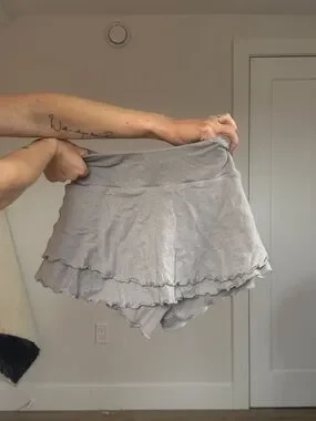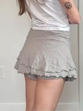 Soft light gray mini skort with a flirty ruffled hem. Comfortable stretch waistband for an easy, flattering fit.