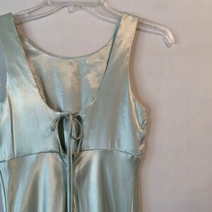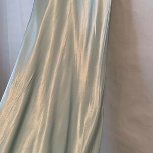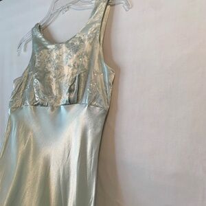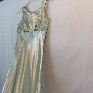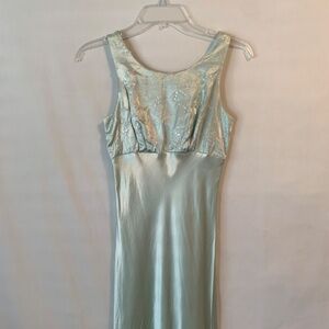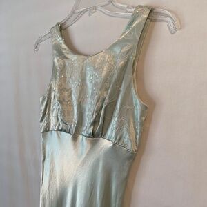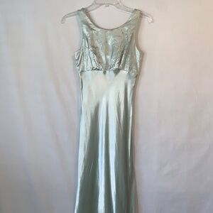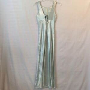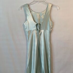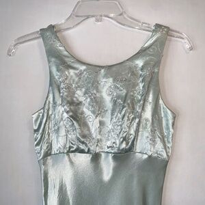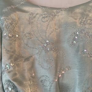 Beautiful elegant , light green formal satin dress with flower sequins on upper front of dress, lined at the bust with keyhole tie back and zippered back from All That Jazz.