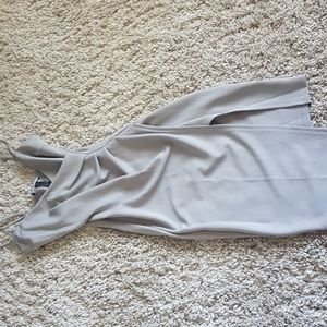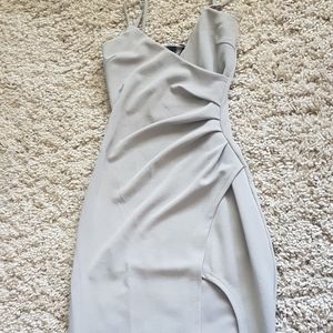 Light grey bodycon dress. Accentuates curves. Size small, can fit a medium tightly as well. Asymmetrical hem, great lines.