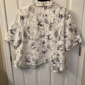 Lightweight fabric jacket with short sleeves. There is a bit of gathering in front 59% cotton 41% polyester.