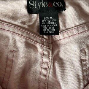 Light pink denim shorts with raw hem that can be unrolled for a longer fit