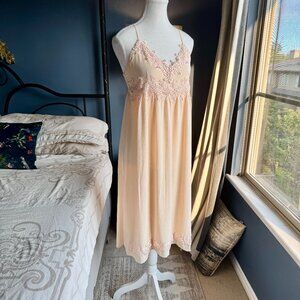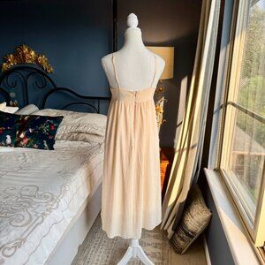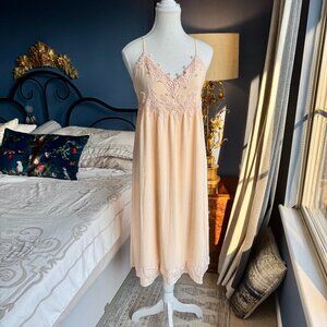 Light ballerina pink babydoll midi dress with floral applique detailing at chest, size M from Forever 21. Lined, adjustable spaghetti straps, zips at back, nice and flowy rayon with a good weight to it. Bust measures 16.5 inches laying flat, 17 inches at waist laying flat, length is 40.75-43 inches. Cat friendly, nonsmoking home.